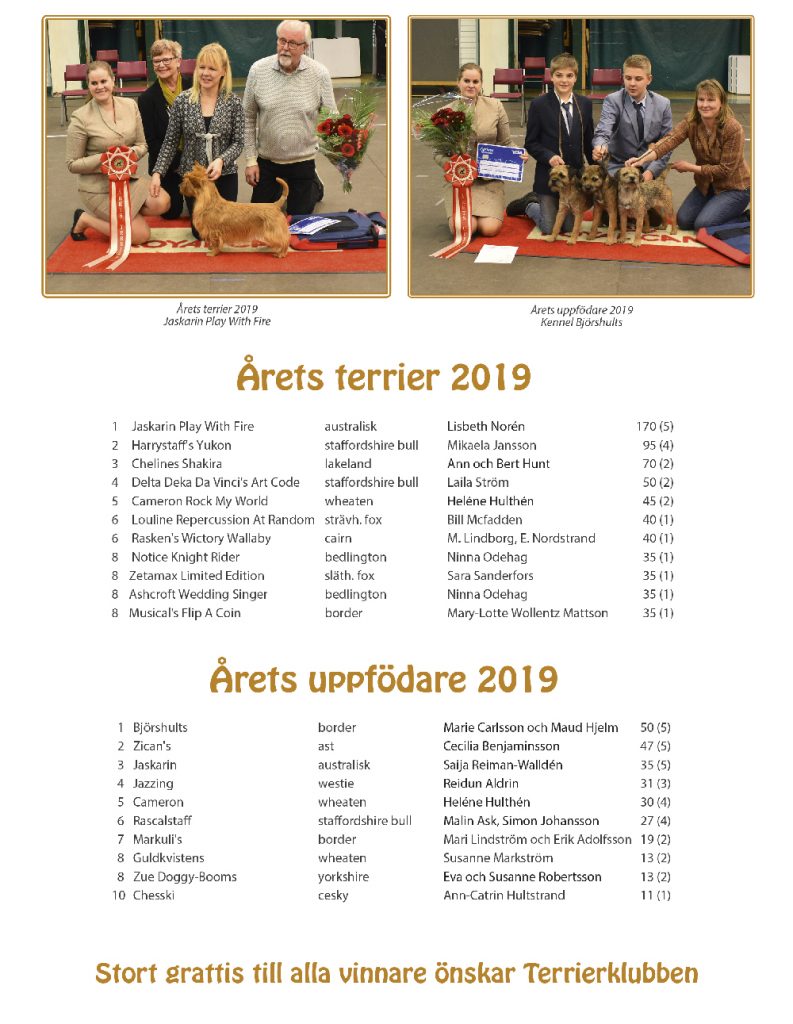 Tio i topp av Årets Terrier 2019 och Årets Uppfödare 2019 är publicerade.