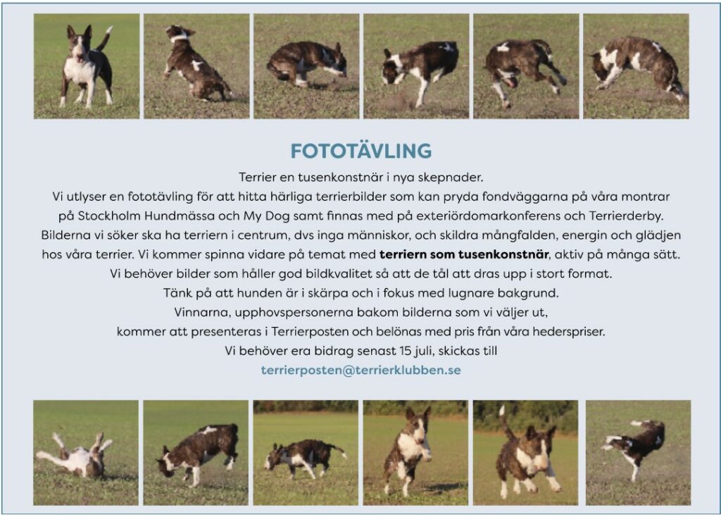 Vi utlyser en fototävling för att hitta härliga terrierbilder som kan pryda fondväggarna på våra montrar på Stockholm Hundmässa och My Dog samt finnas med på Terrierderby och Exteriördomarkonferens.
