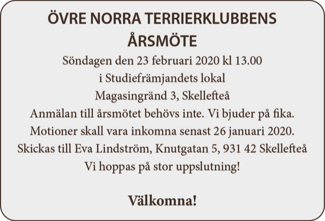 Rättelse: Övre Norra Terrierklubbens årsmöte 23/2